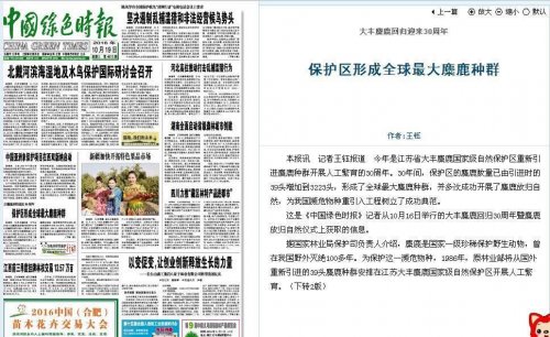 10月19日,中国绿色时报报道“保护区形成全球最大麋鹿种群”。