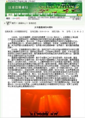 中国大丰网宣传“大丰麋鹿回归30周年暨麋鹿野生放养活动隆重举行”。