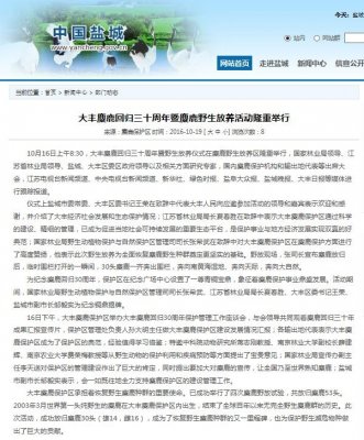中国盐城网宣传“大丰麋鹿回归三十周年暨麋鹿野生放养活动隆重举行”。