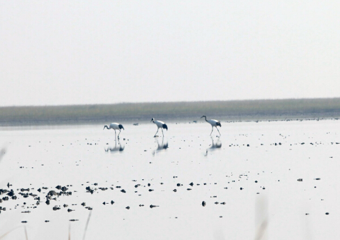 2014年11月26日,保护区工作人员在麋鹿野生放养区进行例行鸟类调查,发现3只丹顶鹤光临了这里的滩涂湿地。