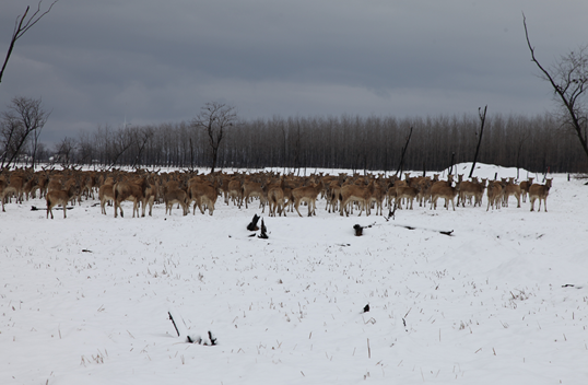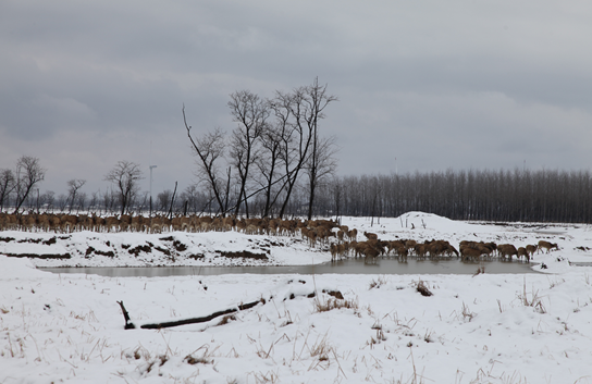 雪景中,脱角生茸的雄鹿、怀有身孕的雌鹿、少不更事的仔鹿诠释着麋鹿世界的祥和;迎风而立、集中就餐的鹿群展示着这一古老家族的团结与坚韧。动静之间,尽显大自然的静谧、安详、和谐。