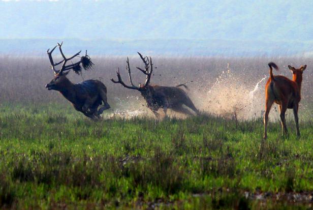 每年6月—8月,麋鹿保护区茫茫滩涂上空飘荡着神秘的气味,这种特殊的荷尔蒙气味,人察觉不到这种气味,可作为南黄海湿地上的旗舰物种麋鹿却为之陶醉、情态各异:雌鹿含情脉脉,雄鹿趾高气扬。目前,有些雄鹿已经开始了小规模的摩擦“角”斗,只是还不是很激烈,主要“战争”在6、7、8月决胜负。
