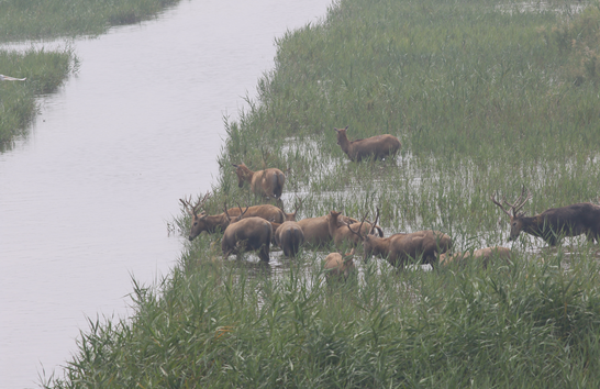 近期由于台风“苏迪罗”带来的强降雨及大潮汛期的影响,大丰野生麋鹿栖息地全部被水淹没,平均水深达1.6m,这迫使野生麋鹿全部被迫集中在新海堤路附近。由于人为因素干扰,有近百头野生麋鹿已经越过川东港河,向北跑至大丰沿海林场一带,甚至来到附近农田寻找临时庇护所。这群野生麋鹿目前栖息的区域超出了麋鹿放养区的范围,极有可能会因为践踏农民庄家而被人为驱赶,甚至遭到伤害。目前,保护区和地方政府高度重视,召开专门的会议,组织了当地公安、农委、林业、林场以及周边乡镇、边防派出所等相关单位加大野生动物保护宣传、保护力度,随时关注野生麋鹿的野外行为及生存状况,并寻找合适时机各地通力合作,尽全力将麋鹿向放养区方向招引,确保野生麋鹿的安全和农作物少受损失。