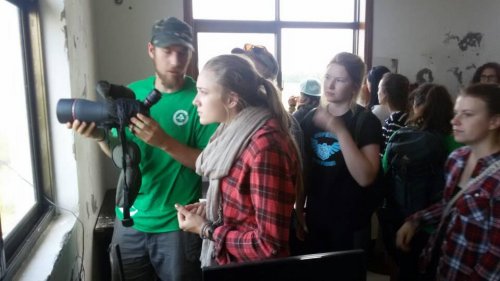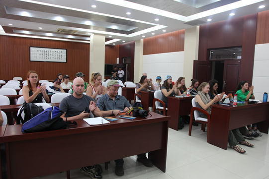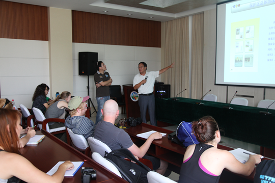 学生们饶有兴致地参观了保护区实验区,随后来到了麋鹿的野外放养区,用望远镜搜寻找到了麋鹿的野外种群,并发现了许多野生鸟类在此栖息,深深的被黄海湿地独特的美好景致吸引驻足,于是纷纷用手机记录了这美好的时刻。在保护区办公楼会议室,保护区管理处孙大明主任做了长达30分钟热情洋溢的演讲,孙主任向外国留学生讲述了保护区历史沿革、麋鹿驯养、湿地保护、生态旅游以及生态文明建设等情况,并诚挚欢迎来访的师生到保护区参观考察。留学生们对麋鹿这一中国特有物种充满了好奇,纷纷提出有趣的问题,孙主任都一一作答,现场气氛格外活跃。