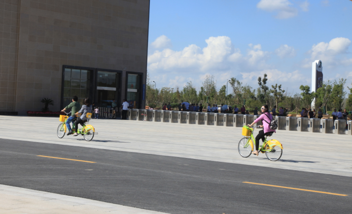 10月4日,天气晴好,温度适宜,中华麋鹿园内除了不时驶过的游览电动车,以及成群结队的漫步游客,还有不少游客是骑着黄色的观光自行车谈笑风生,开心的笑容加上亮丽的颜色,形成了一道醒目的风景线。