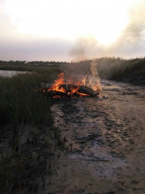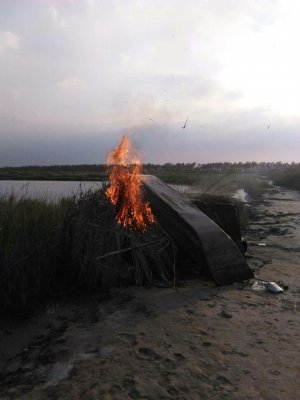 随后执法人员将煤气罐等易爆物品安全隔离之后,将窝棚和盗猎船只点火焚烧,彻底摧毁这个嚣张的捕猎候鸟窝点。