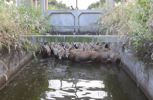 10月14日中午,水渠巡防员赵师傅在巡防水渠时发现有一群麋鹿被困水渠中,便立即拨打电话向川东边防派出所求助。派出所将相关信息通告保护区,和保护区救助人员立刻赶到现场。
