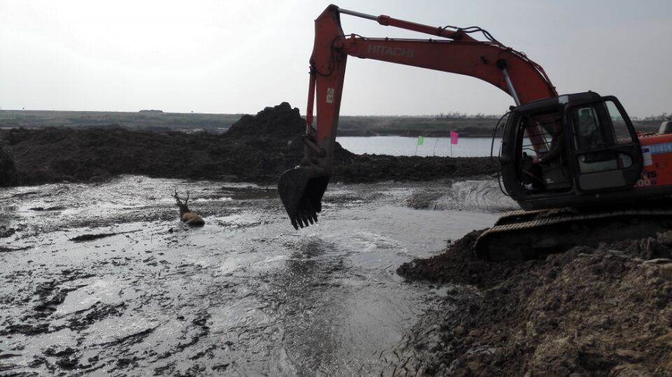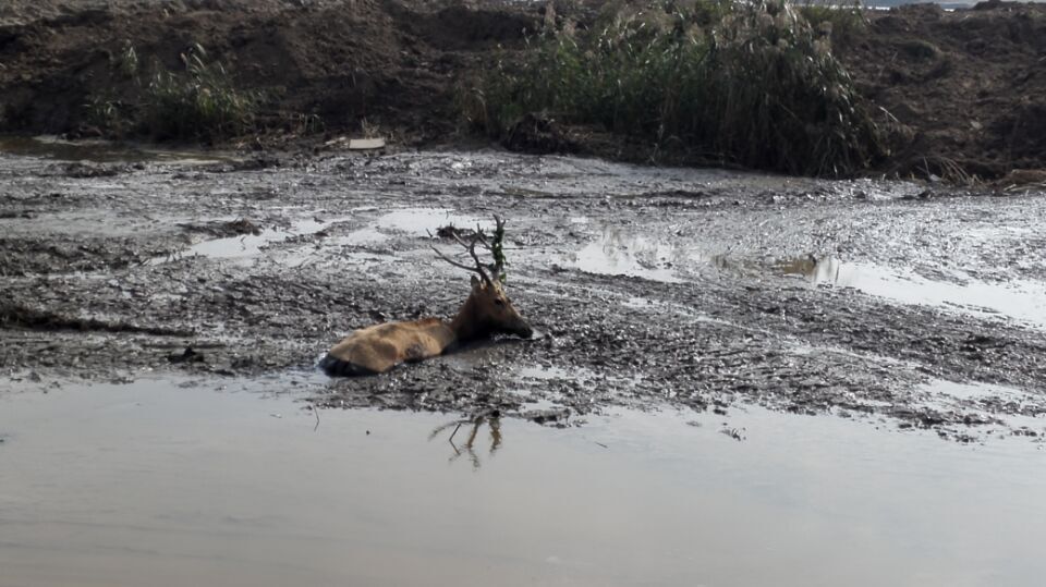 事情发生在10月20日上午。当天凌晨5点多,在盐城市大丰区川东闸附近,淮阴水利建设有限公司一名施工队员早上开工时,突然发现前面沼泽地里陷着一头鹿。“我们是外地人,不知道这是麋鹿。”据了解,当天该公司正在大丰川东闸附近进行清淤施工,有很多淤泥堆积在一个几百平方的深塘里,大约有2米左右深。