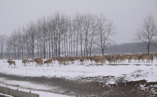 “下雪了,麋鹿吃什么?“这个问题,我们保护区的领导早已考虑到了,对于这个入冬的第一股寒流,保护区提前启动了抗寒应急预案,紧急从外地调运增加了麋鹿的饲料,并且从昨天开始就已经增加了麋鹿的投料量,以往一头鹿需要一天5公斤,从昨天开始增加了2公斤。此外,麋鹿们也很聪明伶俐,在这样的北风呼啸、寒风凛冽的大冬天里,麋鹿身上的背毛被雨雪淋湿了,但是他们一点儿都不怕,不约而同地聚集在一起,抱团取暖,都纷纷躲到小沟里,来到小山坡或大树林旁寻找他们的避风港避风御寒。