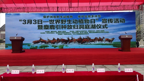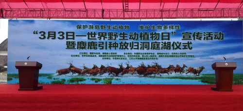 2016年3月3日, 是世界野生动植物日,上午11时许,由国家林业局、世界自然基金会(WWF)、中国绿化基金会牵头组织推动,江苏省大丰麋鹿国家级自然保护区、东洞庭湖国家级自然保护区等多方共同实施的首次麋鹿野放宣传活动在湖南东洞庭湖国家级自然保护区举办。
