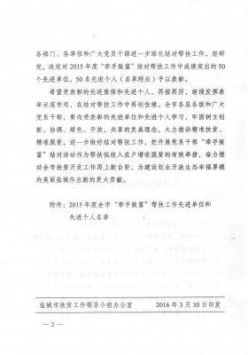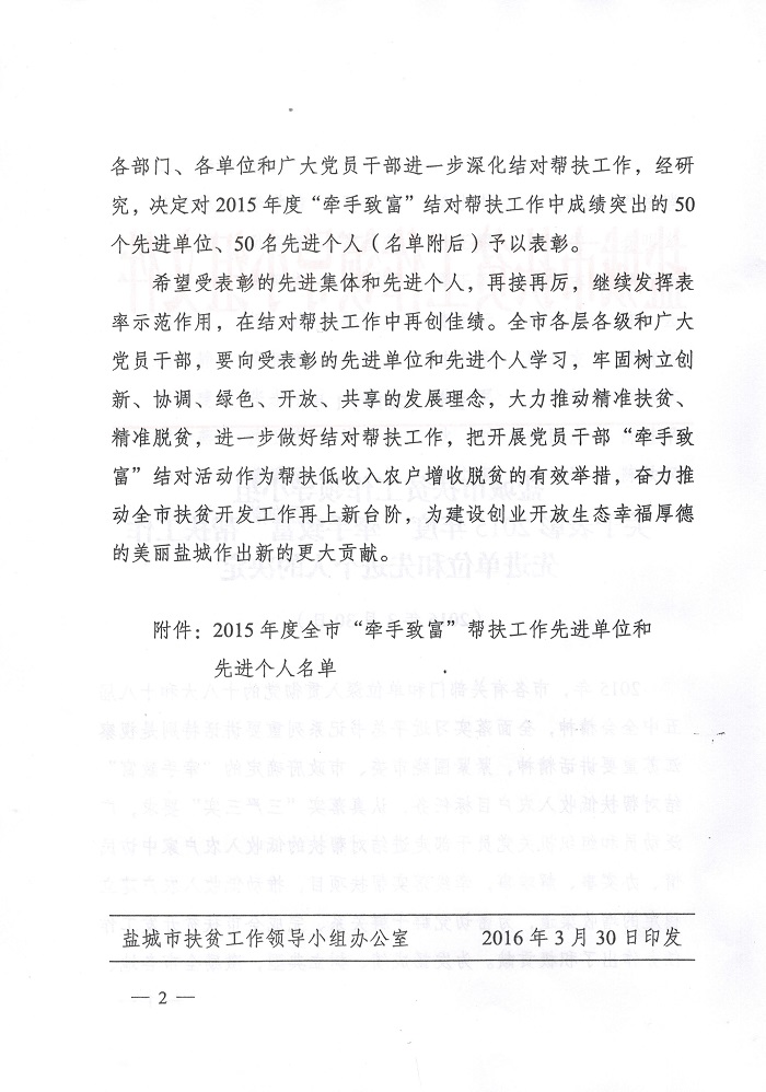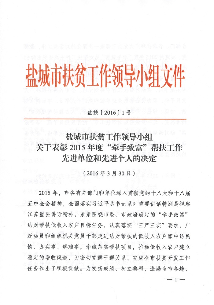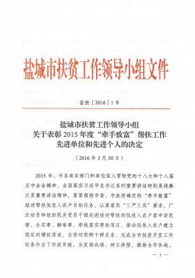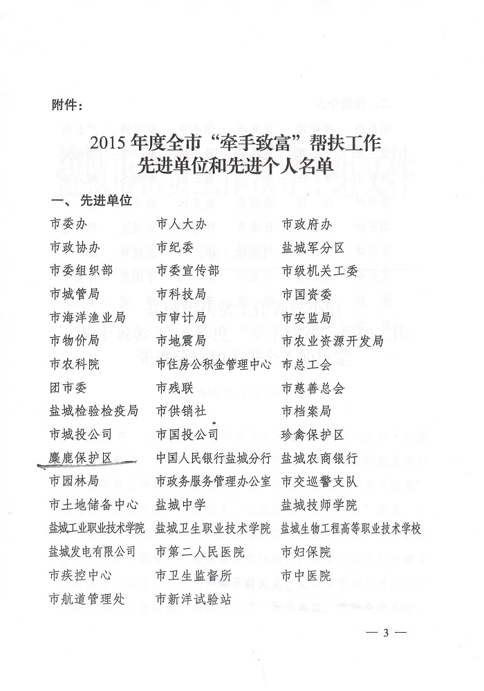 2016年3月3日,盐城市委市政府对全市2015年度“牵手致富”结对帮扶工作进行表彰,江苏省大丰麋鹿国家级自然保护区被评为盐城市2015年度“牵手致富”帮扶工作先进单位。