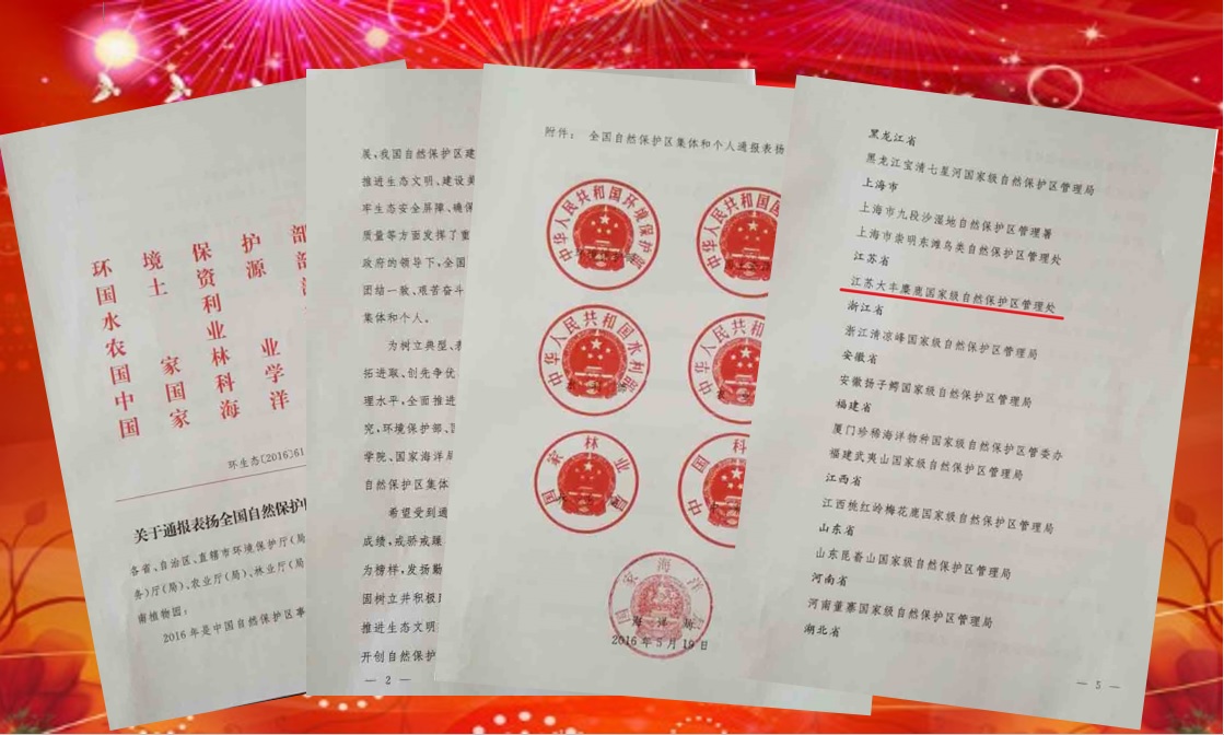 2016年5月22日,“国际生物多样性日暨中国自然保护区发展60周年大会”在北京人民大会堂召开,来自麋鹿保护区管理处主任孙大明出席大会。会上,江苏省大丰麋鹿国家级自然保护区凭借在生物多样性保护、自然保护区建设与管理方面做出的突出贡献,被环境保护部、国土资源部、水利部、农业部、国家林业局、中国科学院、国家海洋局7部委联合表彰为全国自然保护区管理先进集体,这也是江苏唯一一家自然保护区获此殊荣。全国政协副主席韩启德出席大会并讲话。国务院有关部门和地方代表约600人参加会议。
