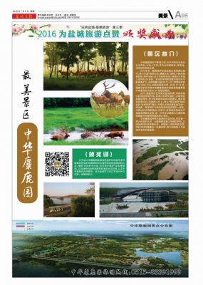 经过大众投票,结合景区综合实力,大丰麋鹿保护区中华麋鹿园获得2016年“玩转盐城,最美旅游”第三季“最美景区”殊荣。2016年7月5日的盐阜大众报与盐城晚报整版报道。