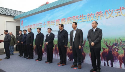 仪式上盐城市委常委、大丰区委书记王荣在致辞中代表大丰人民向应邀参加活动的领导和嘉宾表示欢迎和感谢,并介绍了大丰经济社会发展和生态保护情况;江苏省林业局局长夏春胜在致辞中表示大丰麋鹿保护区通过科学的建设、精细的管理,已成为促进当地社会可持续发展的重要生态平台,是保护事业与地方经济发展实现双赢的好典范;国家林业局野生动植物保护与自然保护区管理司司长张希武在致辞中对大丰麋鹿保护区在麋鹿保护方面进行了高度赞扬,他表示此次野生放养为全面恢复麋鹿野生种群奠定更坚实的基础。野放现场,张司长宣布麋鹿放归后,临时围栏打开的一瞬间,30头麋鹿一齐奔出围栏,奔向南黄海湿地、奔向天际,奔向大自然。