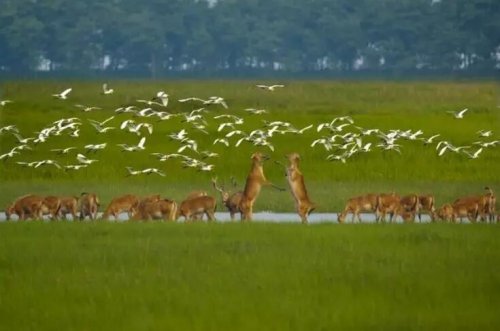 江苏大丰是世界珍稀动物麋鹿的故乡。麋鹿俗称“四不像”,为中国所特有。1985年2月27日,中英两国政府签定了将麋鹿引返中国的协议;经国内外专家考察,大丰东南沿海滩涂的大片湿地被选定为麋鹿放养地点。1986年8月14日,在世界自然基金会(WWF)和国家林业部的共同努力下,39头麋鹿回归故土,顺利闯过检疫、饲养、高温、疾病和繁殖五大难关,截至目前,大丰麋鹿大家庭的成员已达3223头,其中野生麋鹿有295头。1998年和2002年,大丰先后2次将14头麋鹿野生放养并取得了成功。2003年10月26日,在中国大丰第四届国际麋鹿节上,大丰又精心挑选了18头麋鹿放归大自然,为逐步恢复其野生种群奠定了良好的基础,在野生动物保护史上写下了精彩的一页。