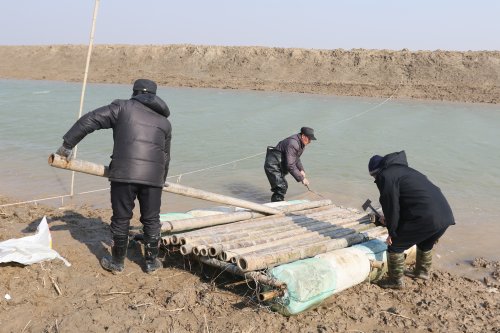 小队在泥泞的滩面上步行2公里之后,在一条河道中发现了3个用竹竿、泡沫板做成的小船,这些小船是非法杂取人员为方便过河而搭建的。这些非法活动的存在,破坏了区内自然资源,也给麋鹿管理工作带来很大的难度。