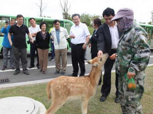 2017年5月24日,全国工商联原常务副主席张绪武来麋鹿保护区参观考察。盐城市委常委、大丰区委书记王荣,盐城政协副主席、江苏省大丰麋鹿国家级自然保护区管理处主任孙大明陪同。