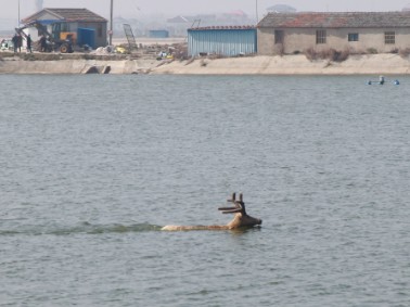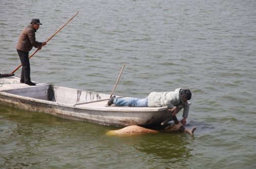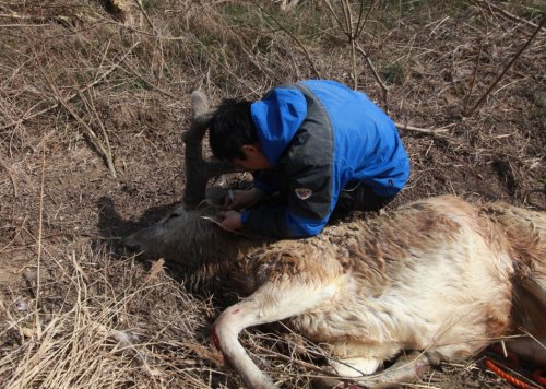 按照该方案实施时,遇到一个棘手的状况:麋鹿麻醉后会晕倒在水中。为了防止溺水身亡,保护区工作人员爬在船上,伸手抓住鹿茸拎起鹿头,确保其鼻子在水面上方,不被抢水。历经半天时间终于成功救出麋鹿,保护区工作人员及周边居民等麋鹿麻醉苏醒后,目送它重归大自然。