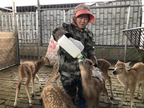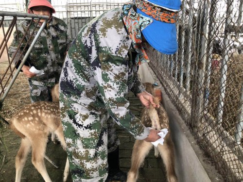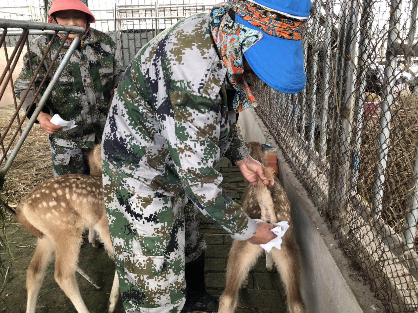 初春,是小麋鹿产仔季节,刚产下来的小麋身上带有梅花斑点,样子特别惹人喜爱,驯养就是从这个时候开始的,仔鹿一生下来,饲养员就把小鹿从围栏里抱回驯养室,首先进行快速处理,包括消毒、擦洗、称量体重体尺、测量体温、打耳标等各项工作,然后放进驯养室,马上给小麋鹿喂上消毒处理过的初乳,离开鹿妈妈的小麋鹿,刚开始多少都有些胆怯,1-2天以后便适应了。