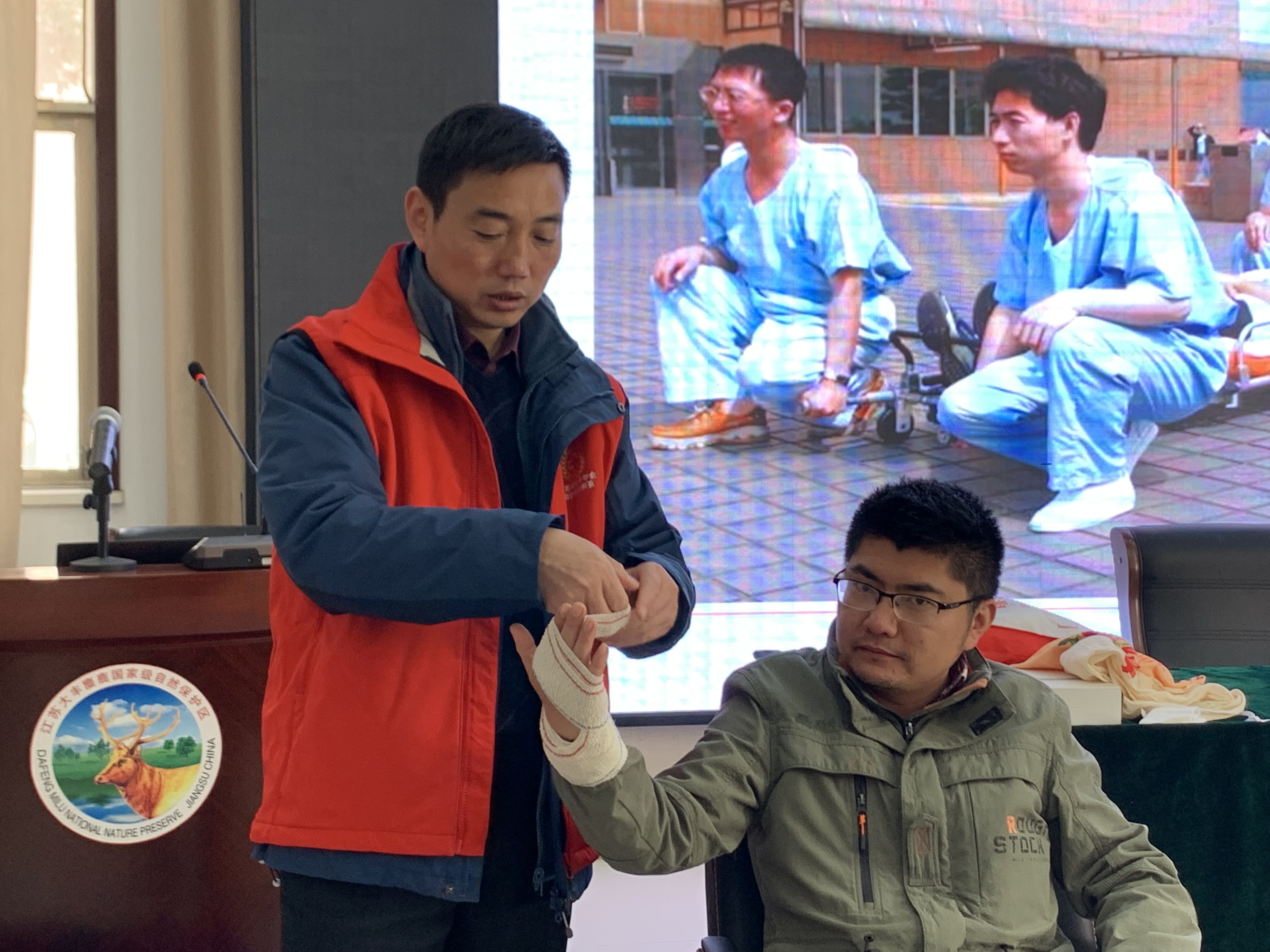 大丰区急救中心沈桂芳主任为大家讲授了心肺复苏课程,大丰区红十字会王银存主任讲授了应急包扎课程,两位老师从理论到实践,循序渐进、逐步深入,让保护区全体职工了解了急救的基本常识和实用技能,提高了职工们在日常工作中的自救与互救等应对突发事件的现场救护能力。