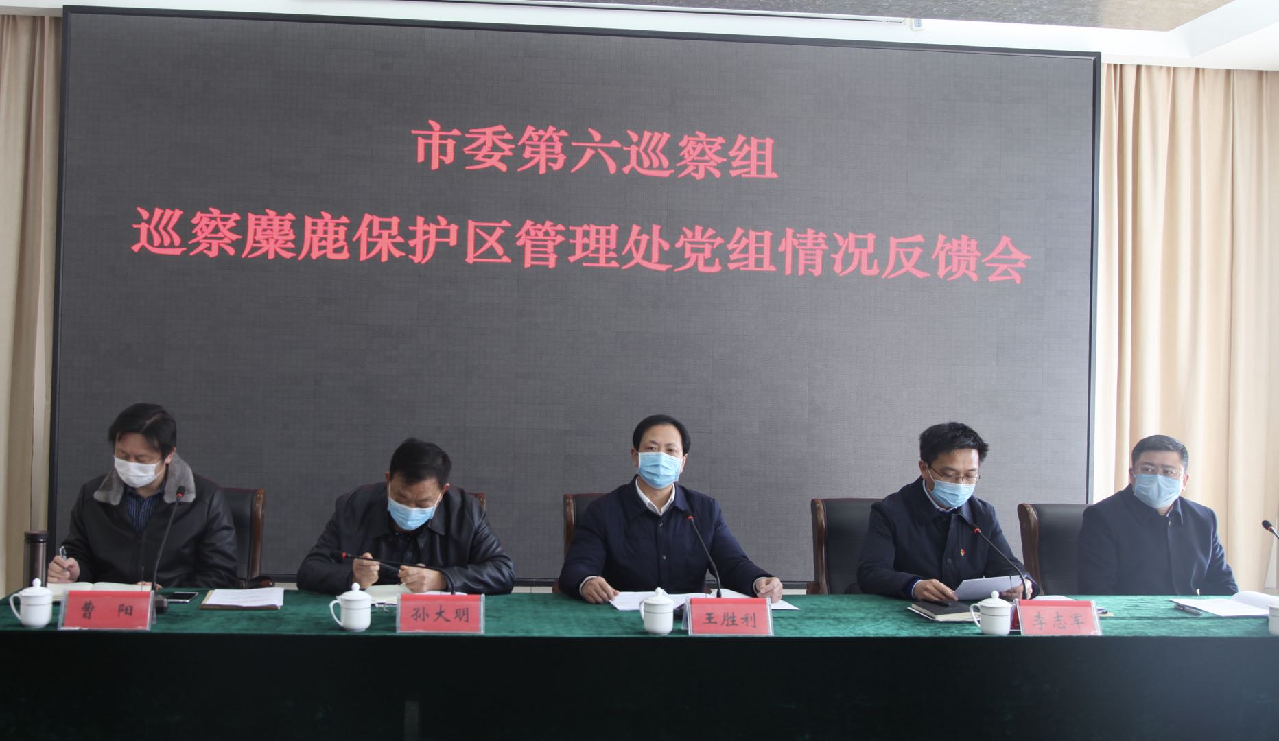 2020年3月4日上午,市委第六巡察组巡察麋鹿保护区管理处党组情况反馈会在保护区召开。市委第六巡察组组长王胜利反馈了巡察麋鹿保护区管理处党组情况,副组长施伟传达了市委书记专题会议精神和市委对整改工作的要求,大丰区委副书记、大丰区区长、麋鹿保护区管理处党组书记李志军主持反馈会并作了表态发言。
