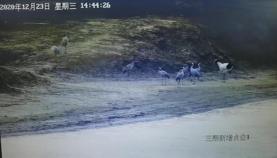 近日,保护区监控摄像头监测发现第三核心区内有10只左右丹顶鹤和20只左右灰鹤在水面、浅滩处觅食,与其他数万只鸟类及麋鹿和平相处,画面十分和谐。