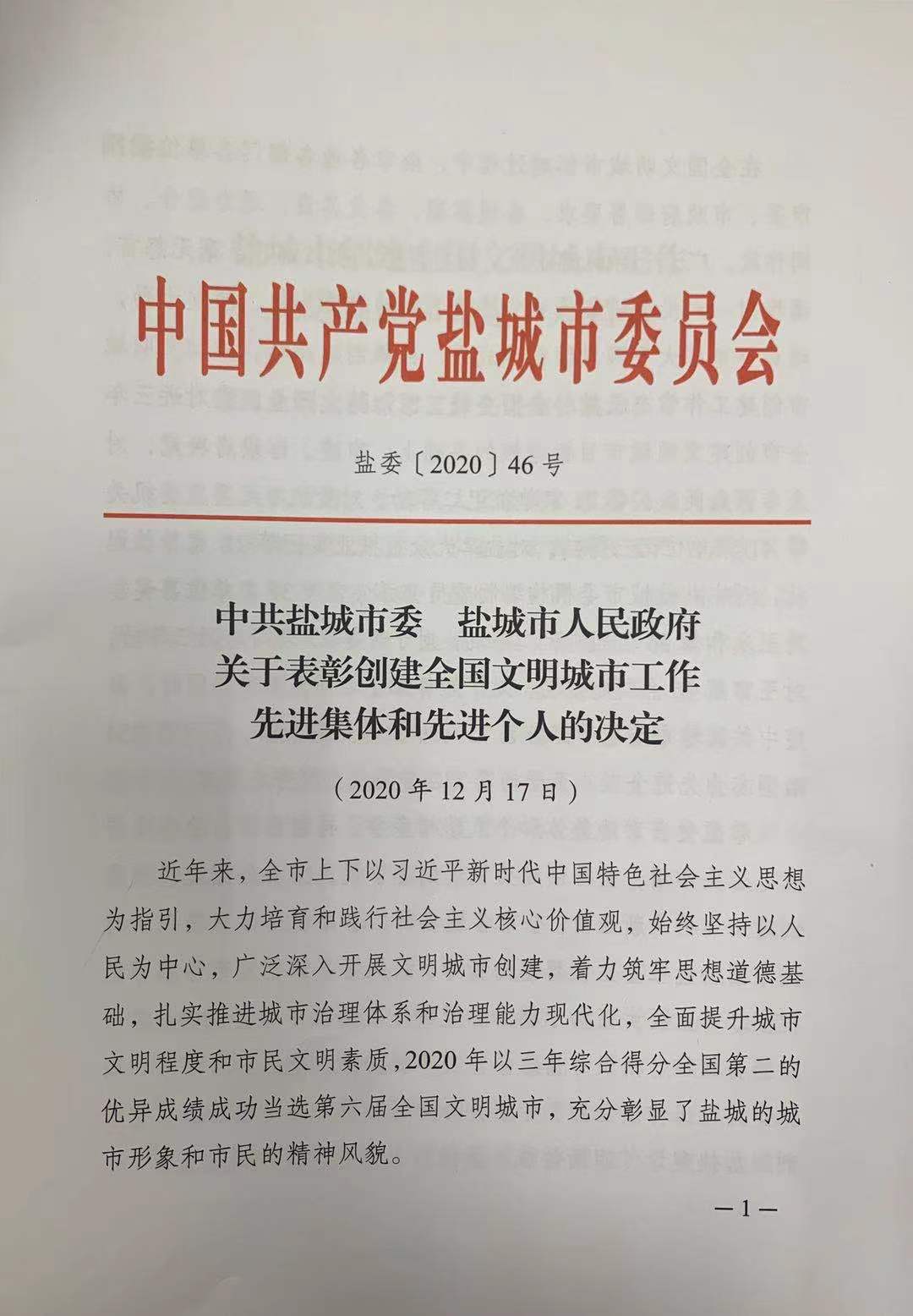 2020年,盐城以三年综合得分全国第二的优异成绩成功当选第六届全国文明城市,充分彰显了盐城的城市形象和市民精神风貌。