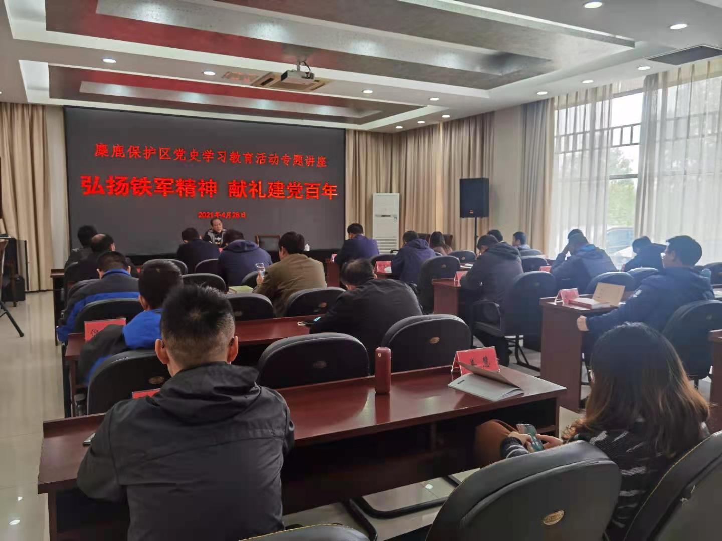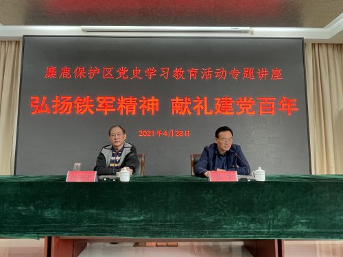为了扎实推进党史学习教育,提高保护区党员干部政治站位,扛起政治责任,确保党史学习教育取得实实在在的成效。4月28日,麋鹿保护区特邀盐城市新四军研究会副会长兼秘书长刘小清教授作“弘扬铁军精神 献礼建党百年”的专题党课。本次党课由麋鹿保护区党组成员、副主任沈华主持。